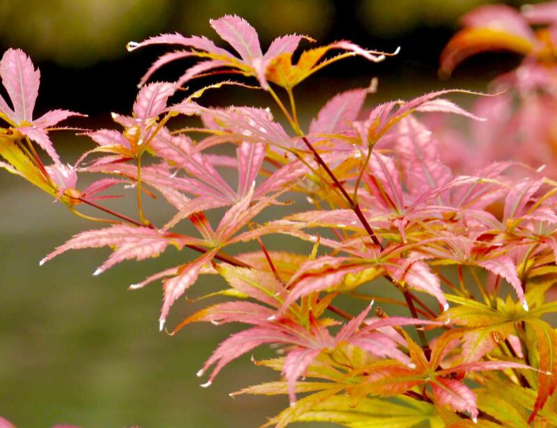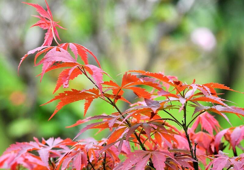 雞爪槭是一種落葉小喬木,其樹皮是比較深的灰色,枝條細弱,而且變化多端,如果是新枝條是紫色的,如果是多年的枝條就是深紫色。其葉比較薄、嫩,如掌狀分裂成7片。其花為紫色的,有5片花瓣,并且雄性花與兩性花是同一株,在5月份開花。